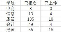 4、因为四月开始的质量诊改工作,部分二级学院未能及时推进,大赛组织工作未能达到目标预期,请各二级学院做好赛事组织发动工作。积极鼓励教师参与项目指导,带领学生创新创业;加强与毕业校友联系,深度挖掘毕业五年之内的毕业生(2014年之后的毕业生),特别是已经创业的校友参与本次大赛;同时,积极动员指导学生发挥专业优势,结合学科优势积极参赛,形成师生人人参与的良好局面。下表为:截止至5月20日各二级学院大赛报名与上传情况。