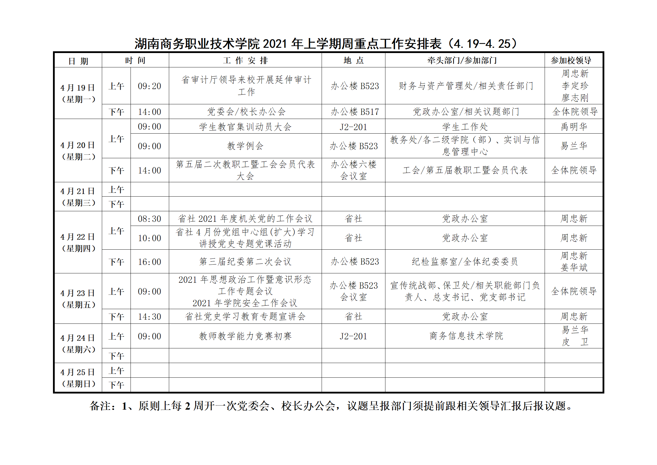 韦德com2021年上学期周重点工作安排表(4.19-4.25)