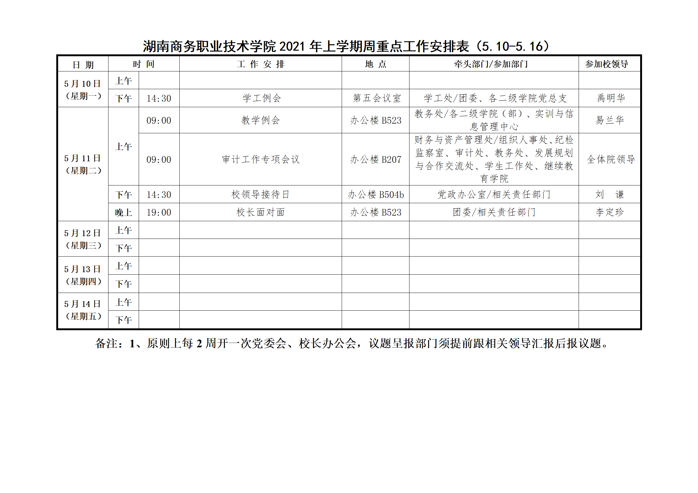 韦德com2021年上学期周重点工作安排表(5.10-5.16)