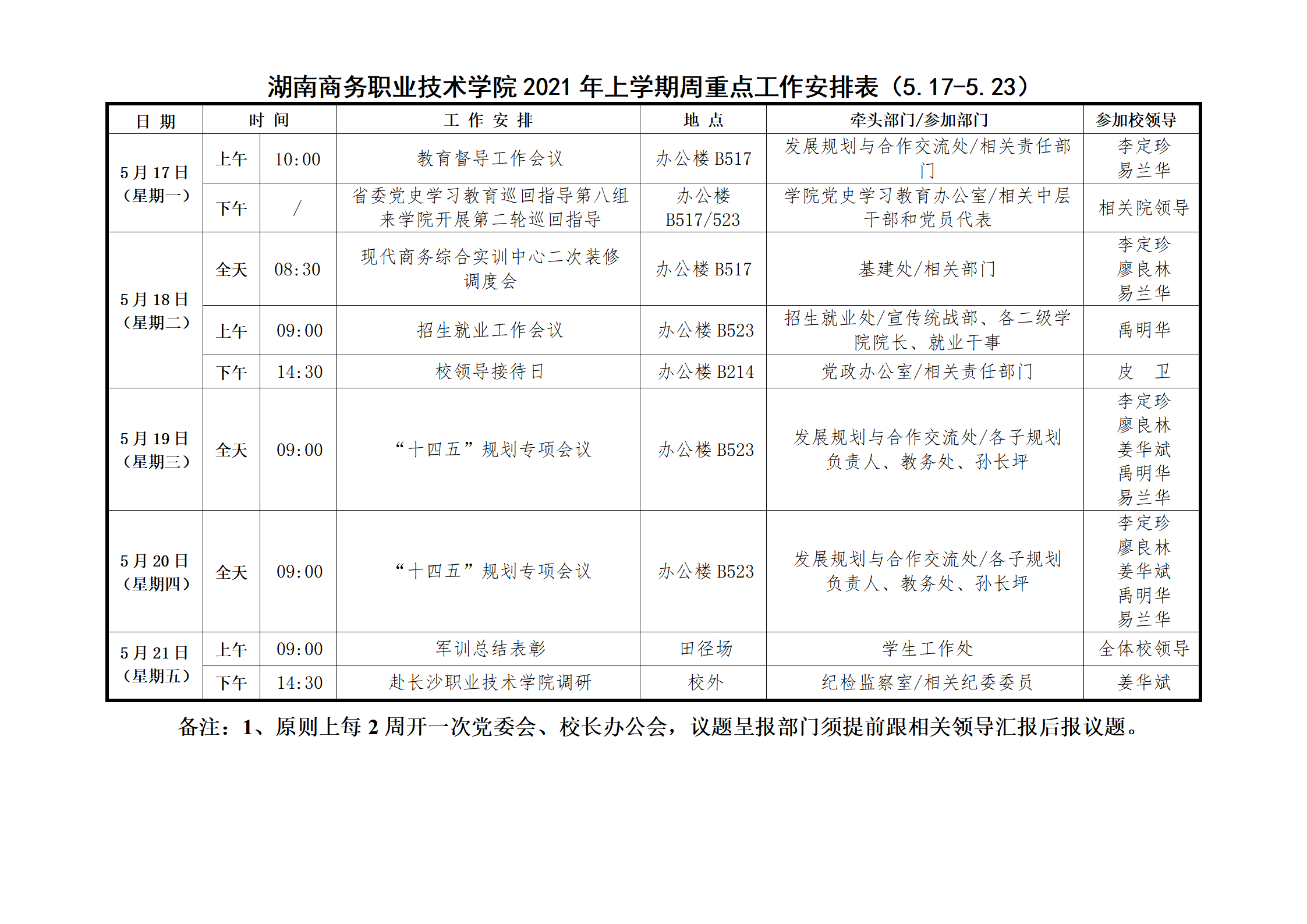韦德com2021年上学期周重点工作安排表(5.17-5.23)