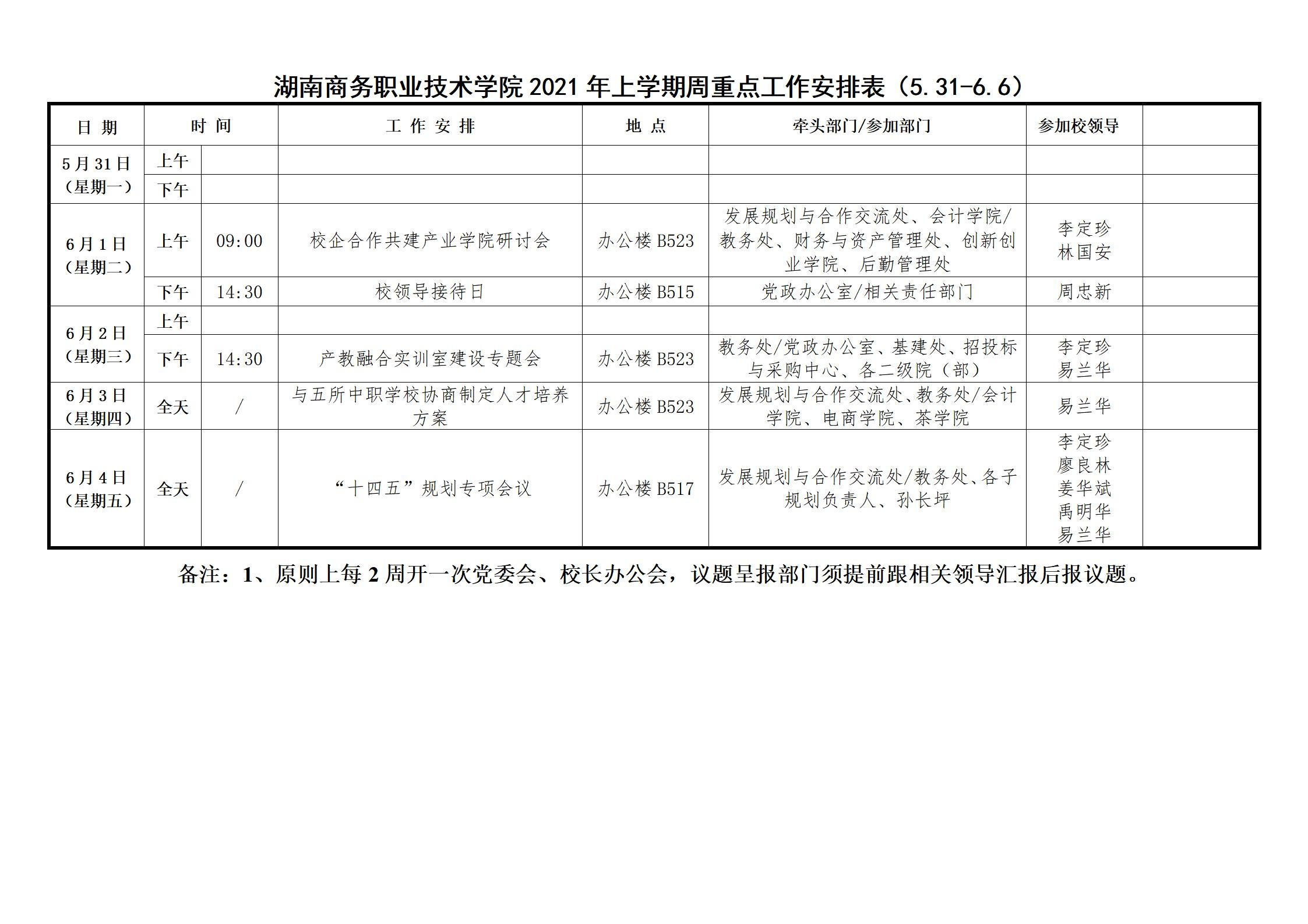 韦德com2021年上学期周重点工作安排表(5.31-6.6)