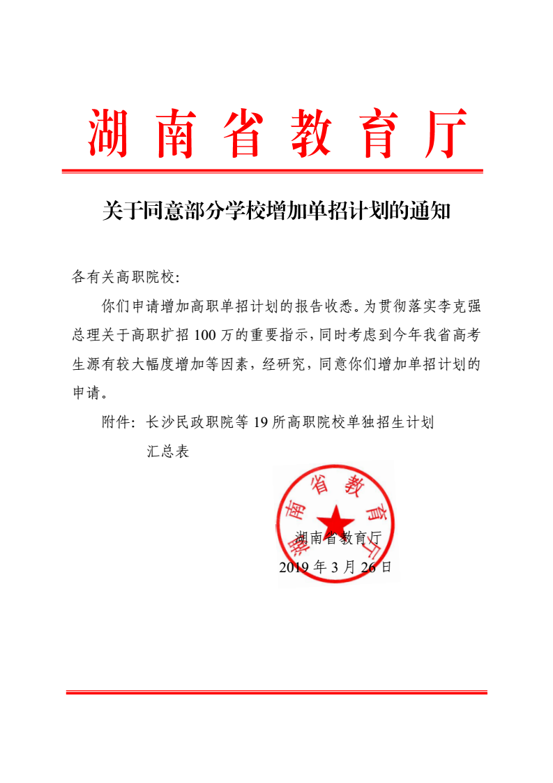 关于增加我校2019年单招计划的通知