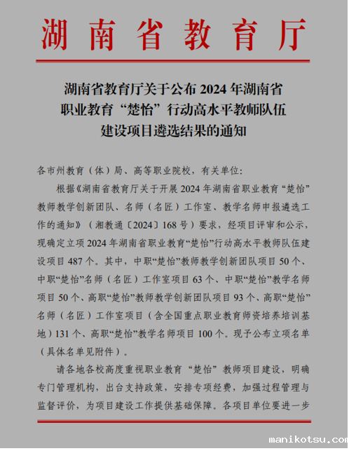 为全面提升教师专业能力,深入推进教学改革与创新实践,推动湖南职业教育向内涵式高质量发展迈进,湖南省教育厅发布《湖南省教育厅关于开展2024年湖南省职业教育“楚怡”教师教学创新团队、名师(名匠)工作室、教学名师申报遴选工作的通知》(湘教通〔2024〕168号)。2024年11月21日,湖南省教育厅公布了高职“楚怡”教师教学创新团队项目名单,电子商务学院申报的国际商务专业“楚怡”教师教学创新团队成功立项。