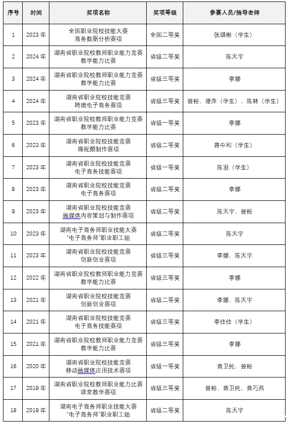 师资雄厚,经验丰富。我院农村电子商务专业师资力量雄厚,专职教师团队近30%老师具备副教授以上职称,三分之一以上的教师有创业经历,多数教师有企业工作经历。本专业界面设计课程团队参加2023年、2024年湖南省职业院校教师职业能力竞赛教学能力比赛,分别荣获省一等奖、省二等奖。