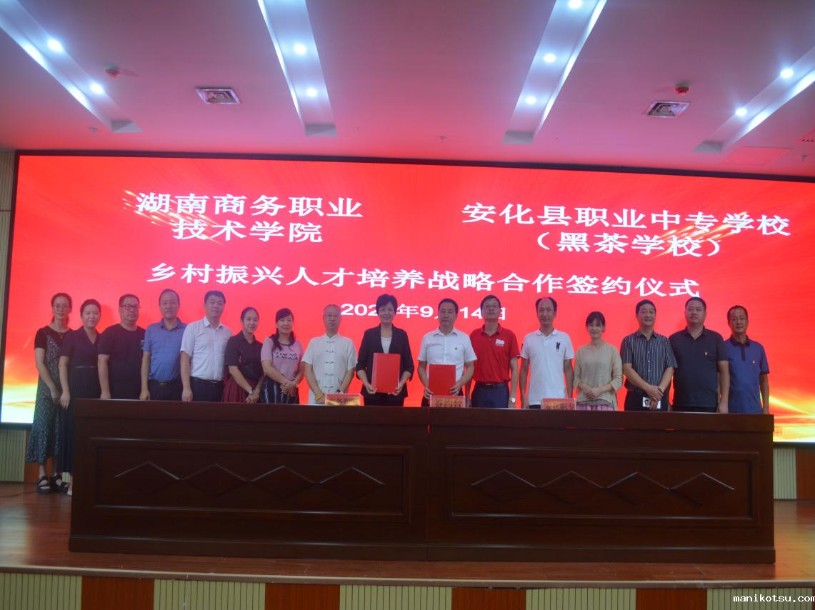 我院到访人员在安化县伍县长、安化县职业中专学校(安化黑茶学校)刘校长等领导的陪同下,参观了安化县职业中专学校(安化黑茶学校)的校园,了解学生的学习与生活环境。参观完毕,双方举行了隆重的乡村振兴人才培养战略合作签约仪式。两校达成一致协议,将携手推进中高职衔街五年制人才培养工作,为乡村振兴事业输送专业人才。