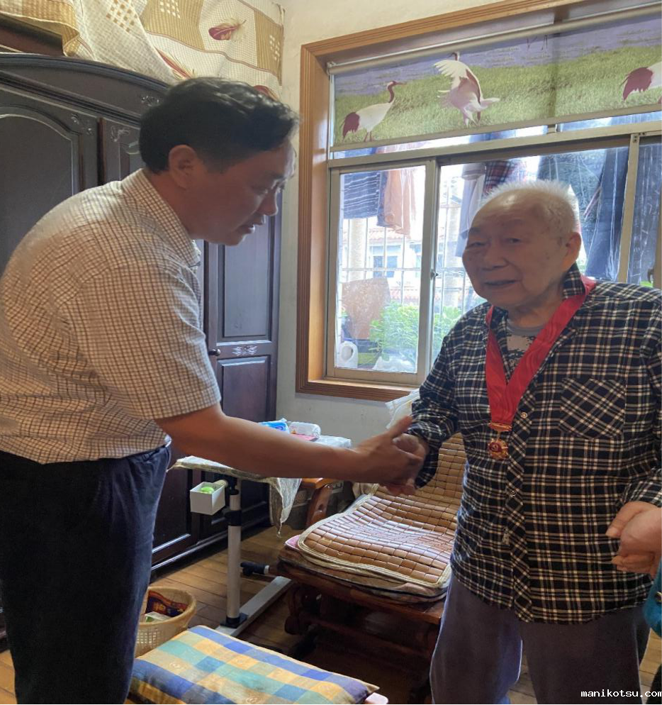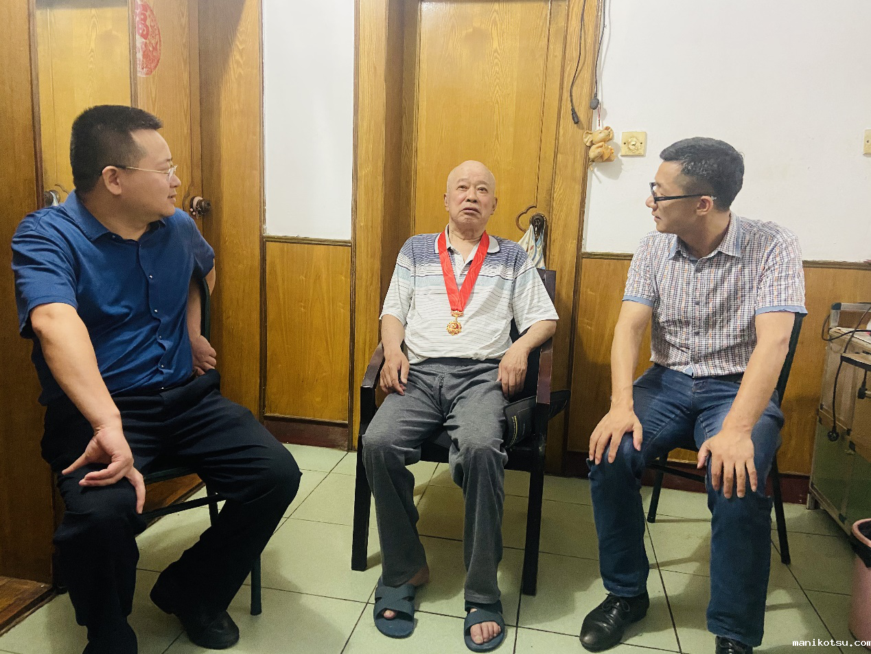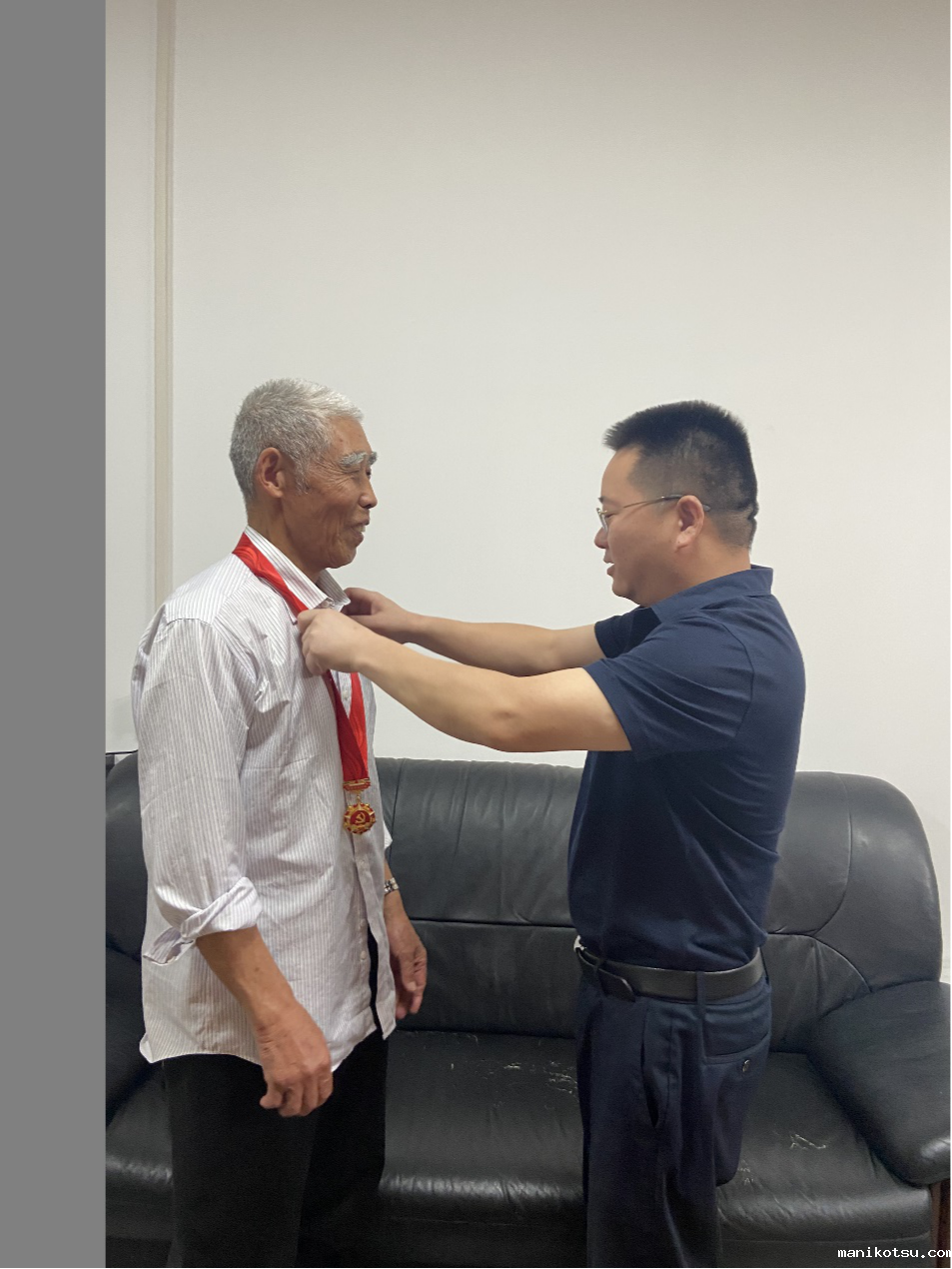离休老党员马世昌同志摸着廖良林副院长为他颁发的纪念章激动不已,病态的面色泛起红润,他握住廖院长的手说:党中央颁发“光荣在党50年”纪念章,是对我们老党员一心向党,赤胆忠心和担当情怀的充分肯定。请院党委放心,我一定会与病魔作斗争,战胜困难,学党史、悟思想,办实事,为党的事业做出新的贡献!