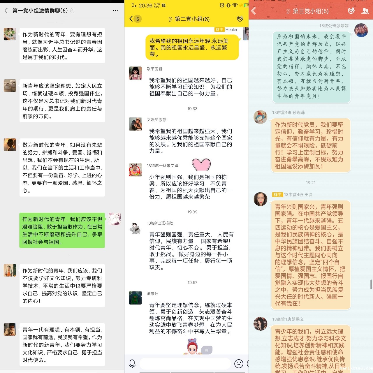 接着,全体同志分组交流青春寄语,并登录“五四运动”纪念馆网址参与献花留言。其中,19茶艺2班唐豪骏谈到:“我们要把个人命运和祖国未来牢牢联系在一起,在有限的生命里无限地奉献自己”;第一党小组陈游同志谈到:“党员要心怀祖国人民,脚踏实地为周围人做实事”;19商管3班朱珠谈到:“我们要怀揣青春梦想,以国家为榜样,在坎坷中奋起直追”;19营销1班王名宇谈到:“新青年要为振兴中华民族而努力奋斗,永不言弃”。
