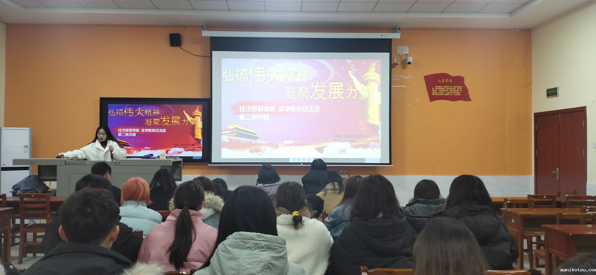 (通讯员 何湘)2020年12月29日14:30,经济贸易学院党支部于二教101教室(经济贸易学院分党校)开展“弘扬伟大精神,凝聚发展力量”主题党日线上线下活动。主持人为“青春向党”先锋营第二小组马洁慧同志,经济贸易学院学工党支部全体党员、入党积极分子参加此次活动,其中18级毕业生党员开展线上活动。