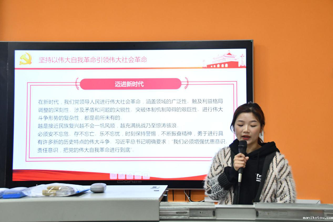 (通讯员 董优梅)为了号召支部党员、入党积极分子全面深入学习马克思主义基本原理和经典著作,深刻把握习近平新时代中国特色社会主义思想,牢记初心使命,推进自我革命,2021年1月5日14:30,经济贸易学院学工党支部于二教101教室(经济贸易学院分党校)开展“把党的自我革命推向深入”主题党日活动,主持人为“青春向党”先锋营第三小组成金维同志,经济贸易学院学工党支部全体党员、入党积极分子参加此次活动,其中18级毕业生党员开展线上活动。