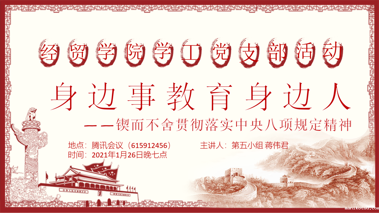(通讯员 易荣淼)为锲而不舍的学习贯彻落实中央八项规定精神,坚持严字当头,敦促支部全体党员自觉加强党性锻炼,强化思想认识,不断筑牢廉政意识,2021年1月26日晚上7:00,经济贸易学院学工党支部通过腾讯在线会议网络平台开展“以身边事,教育身边人”主题党日活动。本次主题党日活动由“青春向党”先锋营第五小组蒋伟君同志主持,经济贸易学院学工党支部全体党员、入党积极分子参加此次活动。