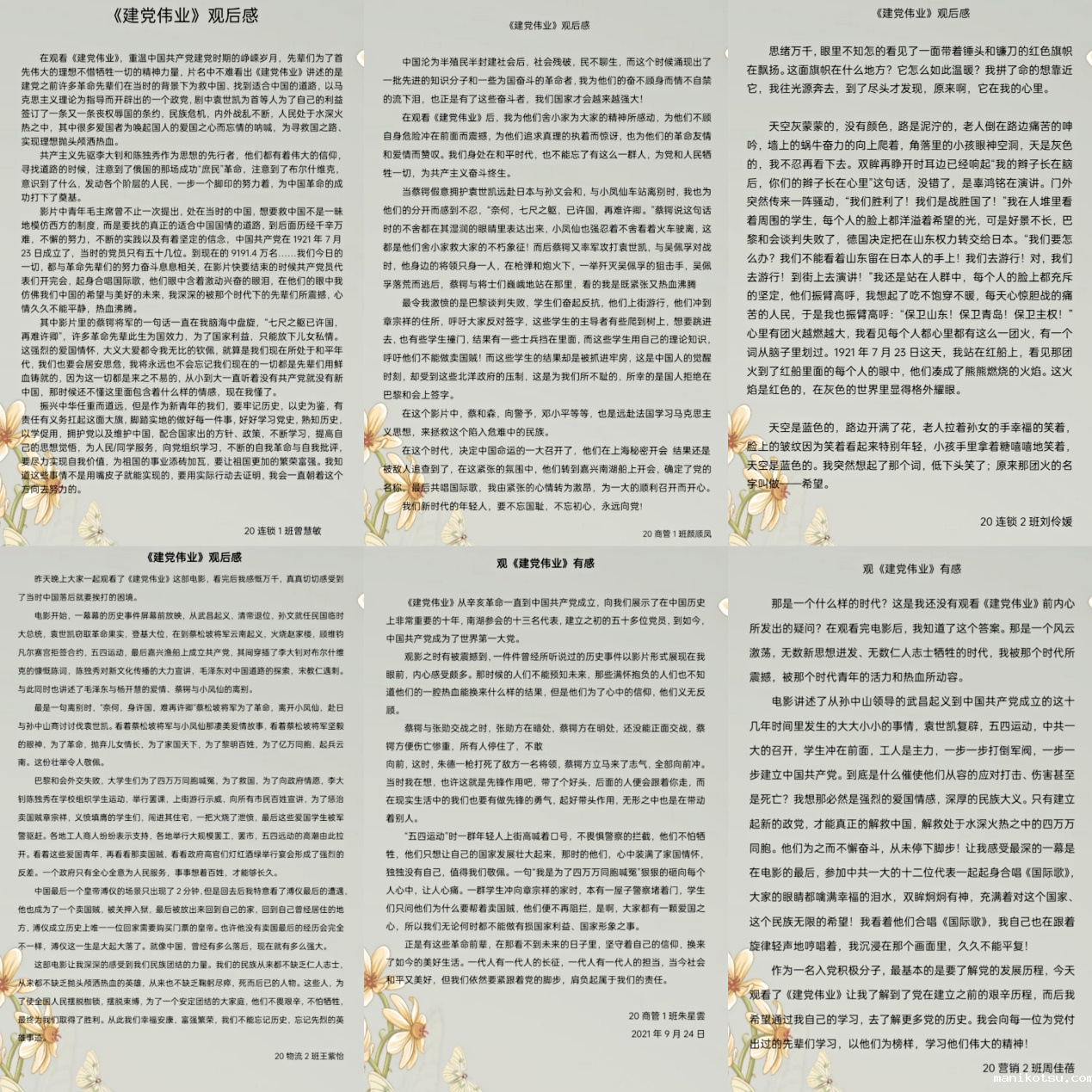 该电影讲述了从1911年辛亥革命爆发至1921年中国共产党第一次全国代表大会召开共10年间中国所发生的一系列重大历史事件,体现了我国在国家体制上的艰难探索及中国共产党建立的来之不易。影片还原了中国共产党成立前的激荡岁月,当马克思主义的理念传到中国,以李大钊、陈独秀为代表的一批思想先进者,为此,前仆后继地做出不懈努力的故事。观影结束后,各小组组织讨论并撰写观影心得。第四小组罗荔恒同学说:“观看《建党伟业》,重温中国共产党建党那段峥嵘岁月,感受革命先辈崇高的信仰,以及他们为了自己的崇高信仰而执着地去努力奋斗,使我再一次深深地被他们的革命精神所感动,自己的理念信念也得到了洗礼,思想境界也得到了进一步升华。” 接着,第三小组王金华同学有感而发,她说:“当我全神贯注地观看完《建党伟业》的时候,让我为之震撼的是仁人志士们对党的担当与责任,是对这个国家的深沉而挚爱的保卫,是抛头颅、洒热血、前赴后继地追寻着中国的前途和未来的使命。”