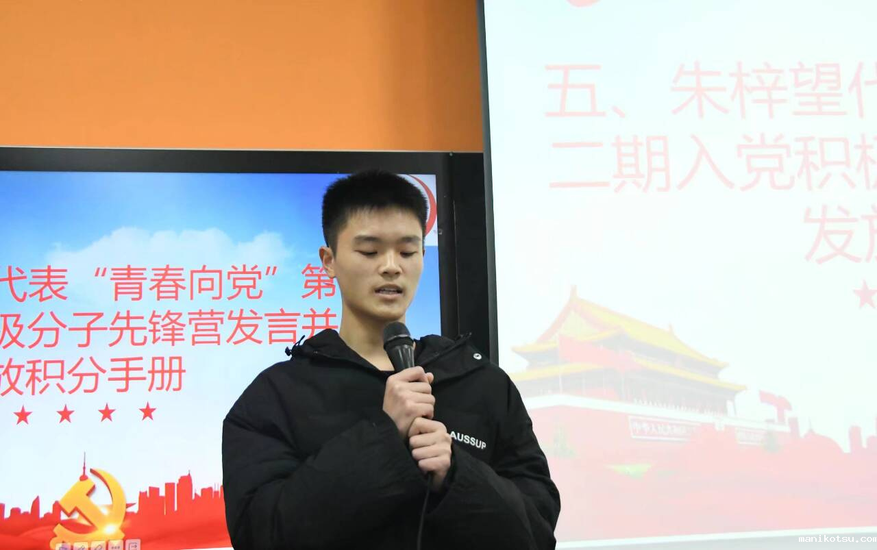 随后,营长朱梓望代表第二期“青春向党”入党积极分子先锋营营员发言。他说道:“自懂事以来,加入党组织的理想是我一直追求并为之奋斗的。一直以来,共产党员这一光荣称号不断激励着我,成为我工作、学习、生活的最大动力和奋斗目标。加入先锋营的日子里,经过不断学习,我更加深刻的领会到我们党的进步性和先进性;经过不断学习,我从理论和实践两方面加强了对党性的理解和对党的先锋模范作用的认识,更加坚定了以党员标准严格要求自己的决心和信心。我相信,加入“先锋营”,我们将是最有朝气的青年人。我相信,和大家在一起,我们将成为最好的自己。”
