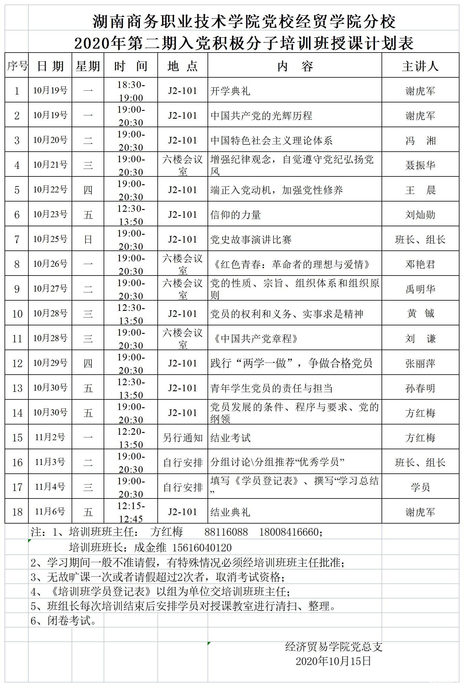 韦德com党校经贸学院分校2020年第二期入党积极分子培训班授课计划表