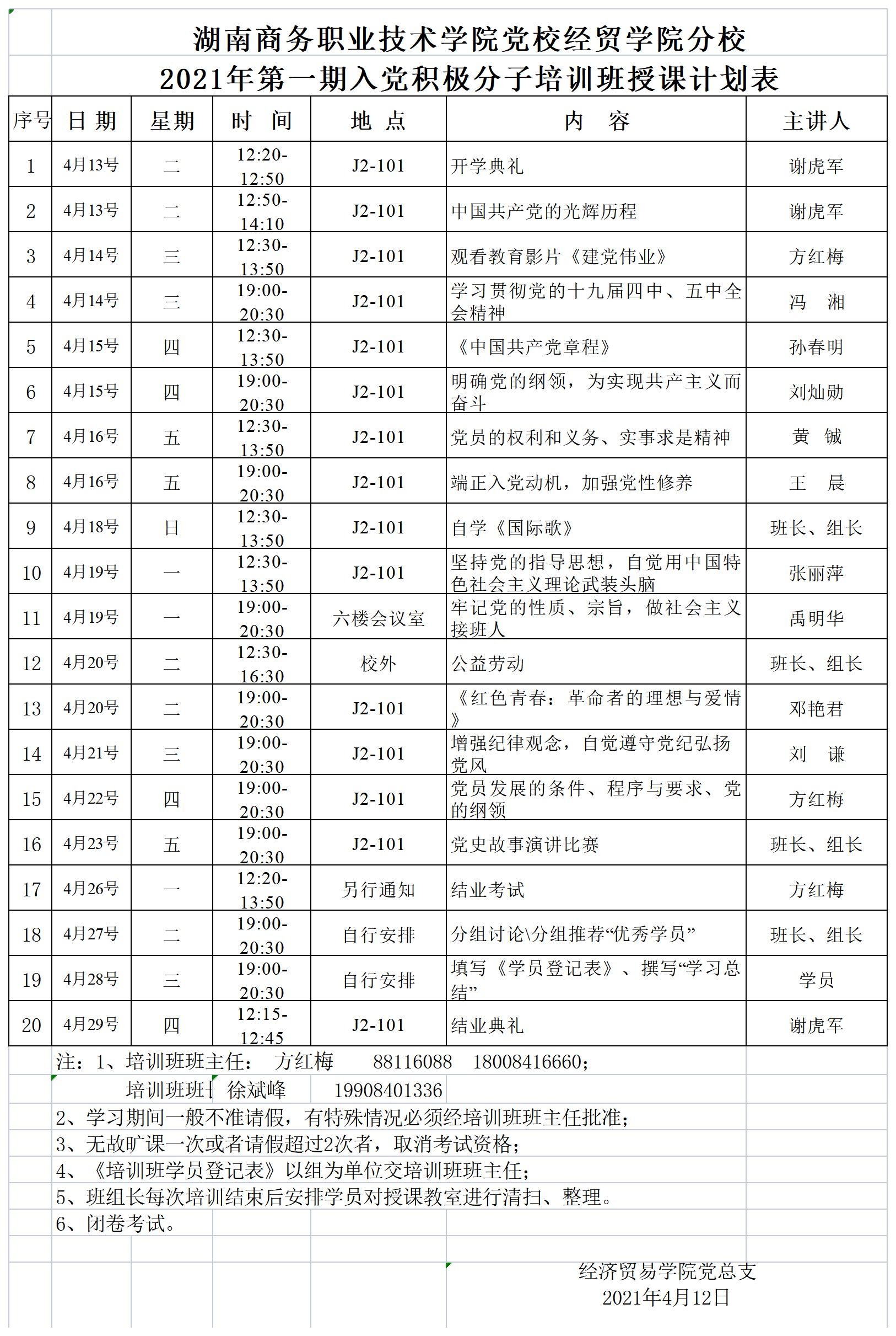 韦德com党校经贸学院分校2021年第一期入党积极分子培训班授课计划表