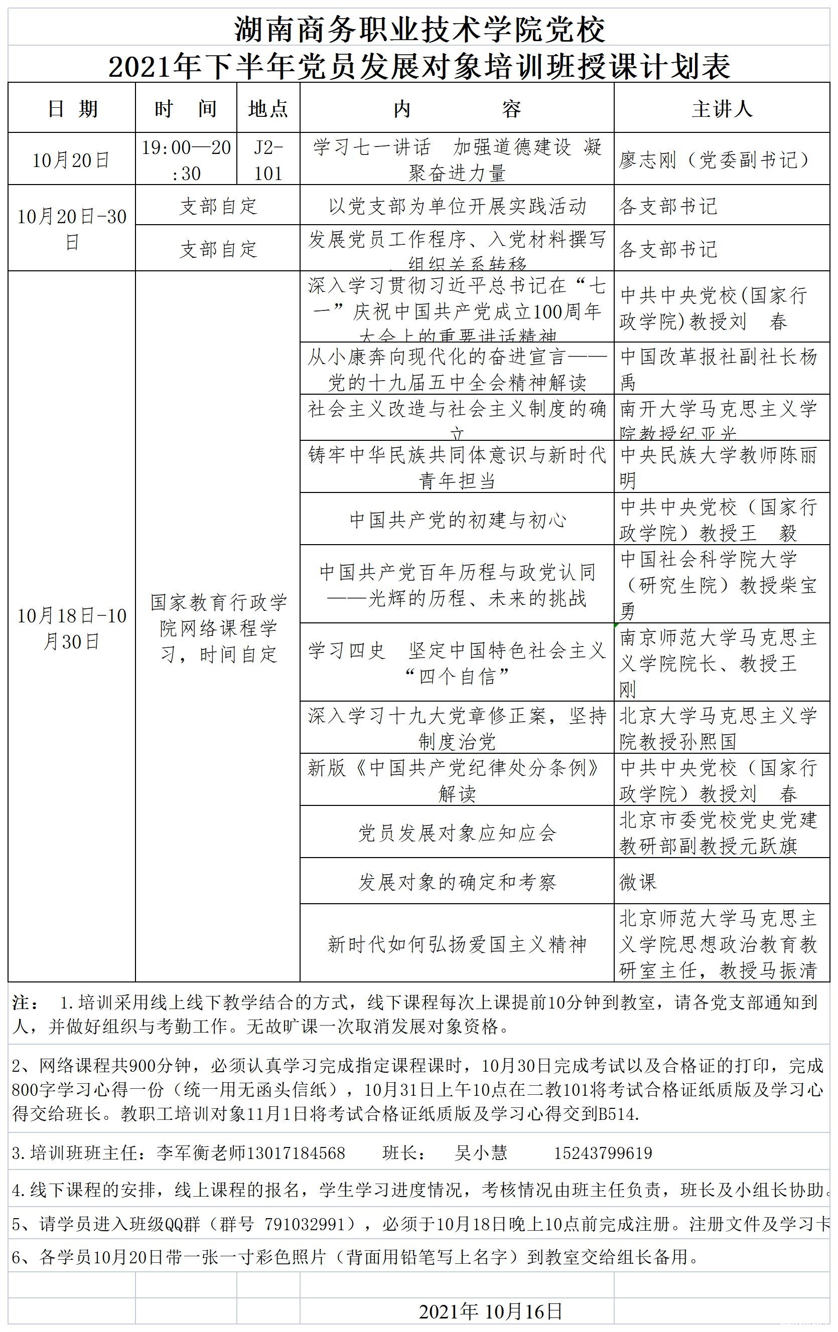 韦德com党校2021年下半年党员发展对象培训班授课计划表