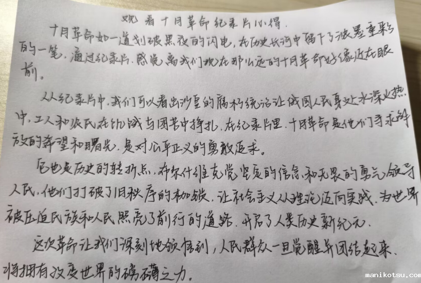 观影前,主持人简要介绍了纪录片的主要内容。“俄国十月革命的胜利让我们看到了历史背后人民的力量。”观影结束后,大家纷纷在现场分享了自己的观影心得。台下掌声雷动,散场后,部分同学通过视频记录的方式朗读了自己的观影心得,并将心得发至朋友圈,让更多人了解俄国十月革命的重要历史意义。