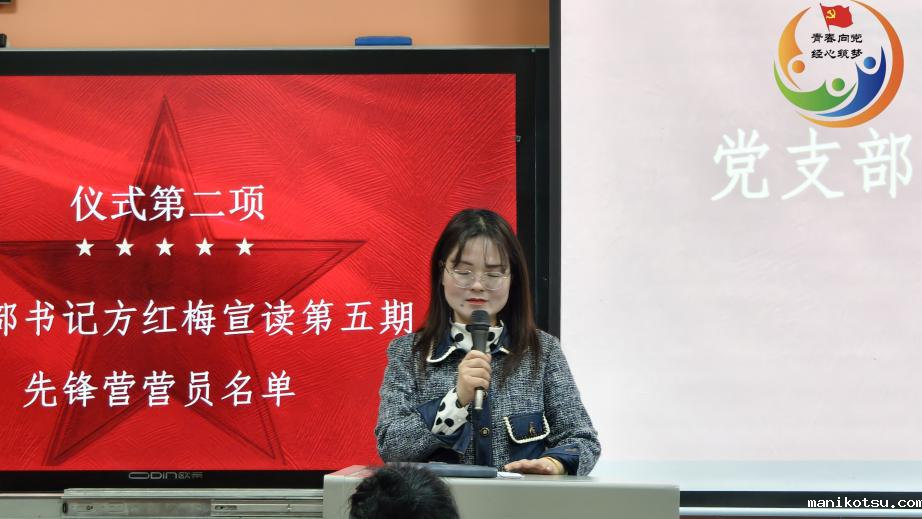 仪式开始,全场肃立,奏唱国歌。随后,党支部书记方红梅宣布第五期“青春向党”入党积极分子先锋营开营仪式正式开始,并宣读了第四期先锋营结营人员名单及第五期先锋营营员名单。她寄语全体营员,希望大家在“先锋营”这个充满正能量的集体中同心同力同行,向深向实向远。