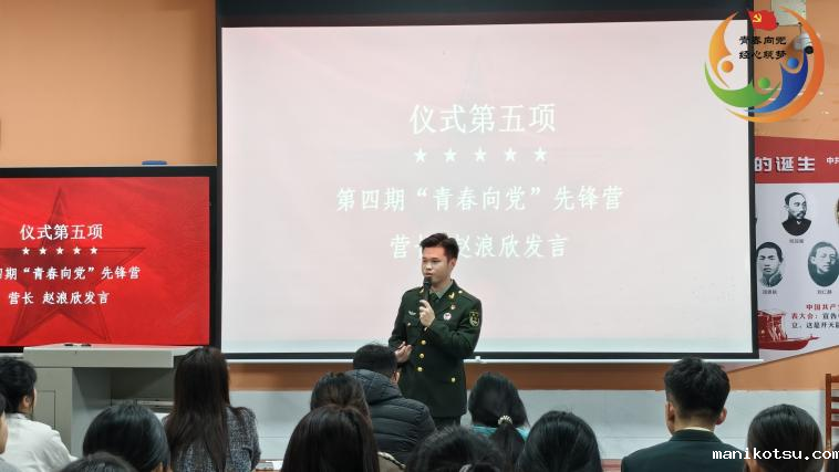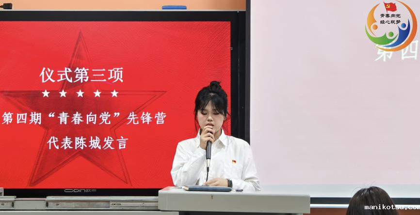 紧接着,第四期“青春向党”先锋营代表陈城发言,她分享了加入先锋营的初衷和在先锋营中的收获。“青春是奋斗的岁月,是追梦的时光。加入先锋营,是我们向党组织靠拢的重要一步,也是我们锤炼党性、提升自我的重要平台。在这里,我们将接受党的教育和培养,学习党的理论和路线方针政策。同时,我们也将积极参与各种实践活动,锻炼自己的各项能力,为成为一名合格的共产党员打下坚实的基础。最后,我想对大家说‘请务必珍惜这难得的机会,请一定以共产党员的标准严格要求自己,用实际行动践行党的宗旨和誓言。’”