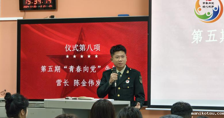 接过营旗,第五期“青春向党”先锋营营长陈金伟声情并茂的发言。他说道:“作为先锋营的一员,我们不仅要做到个人优秀,更要做到团结协作、共同进步。我们要像坚硬的钢铁一样,紧紧凝聚在一起,形成强大的战斗力!”