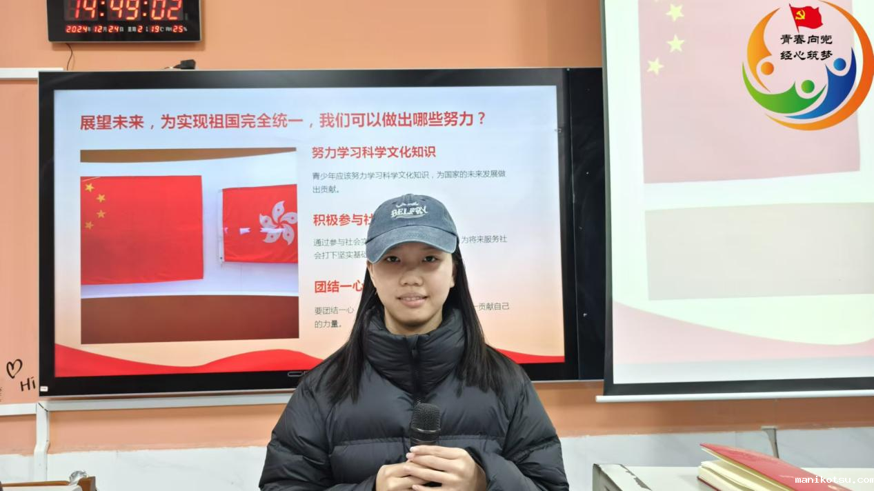 主持人借一段澳门回归时的纪录片段,让同学们的情绪随着冉冉升起的五星红旗而澎湃。从澳门回归的“背景意义”、“发展变化”、到“爱国爱澳精神传承与弘扬”,主持人用幽默诙谐的语言、生动典型的事例让同学们对“血脉相连一家亲”有了更加深刻的感触。