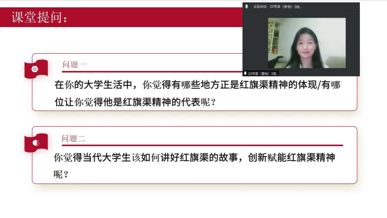 最后,主持人组织大家进行分享交流,23级市场营销(楚怡)2班白一茜谈论道:“通过今天的学习,我真切感受到红旗渠精神中蕴含的艰苦奋斗、团结协作力量之强大。林县人民在缺水的困境下齐心协力、迎难而上的精神值得我们永远学习。”23级全媒体广告策划与营销1班周雨萱也感悟道:“林县人民以这种精神,凭一锤一铲一双手,在悬崖峭壁上建成了‘人工天河’。作为新时代青年,我们应传承此精神,为民族复兴贡献青春力量。”