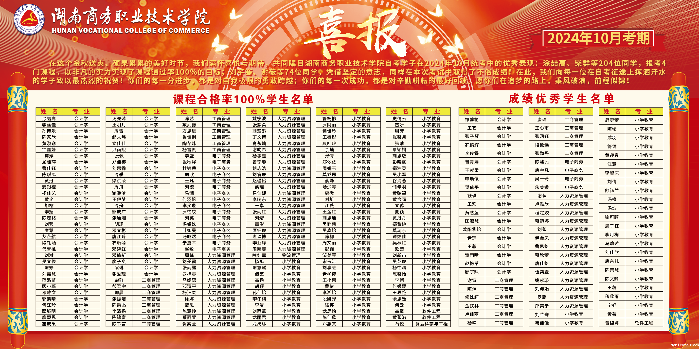 星光不问赶路人,岁月不负有心人。2024年10月高等教育自学考试成绩于已公布,我校自考专本同读班的学子们凭借不懈的努力,再次交上亮眼答卷、续写佳绩!