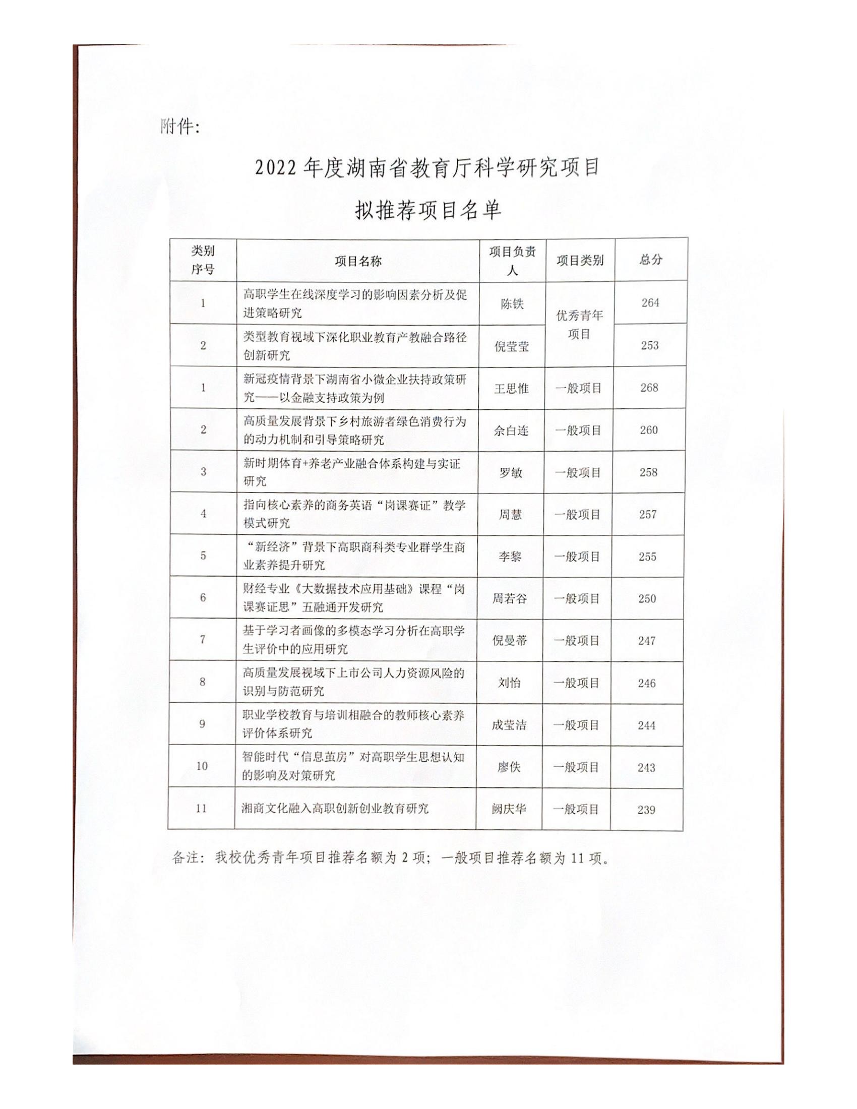 根据湖南省教育厅《关于申报2022年度湖南省教育厅科学研究项目的通知》要求,经个人申报、外请专家网络评审、学术委员会审议,拟推荐《高职学生在线深度学习的影响因素分析及促进策略研究》、《类型教育视域下深化职业教育产教融合路径创新研究》2个项目为优秀青年项目;《新冠疫情背景下湖南省小微企业扶持政策研究——以金融支持政策为例》等11个项目为一般项目。现将拟推荐名单予以公示(见附件),如有异议,请于10 月16 日前以书面形式向科研处或纪检监察室反映。