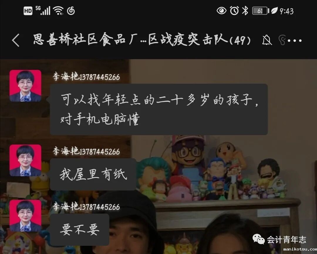 除值守人员外,葛晓倩同学还是一名社区文字编辑者。社区管理员大部分是叔叔阿姨辈的,对手机熟练度没有青年强。在看到群里寻求帮助的叔叔阿姨后,葛晓倩同学主动接手相关文字信息工作,协助其完成人员信息的搜集填写。