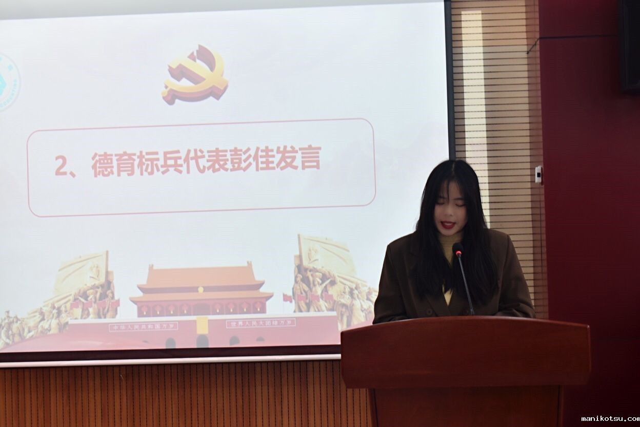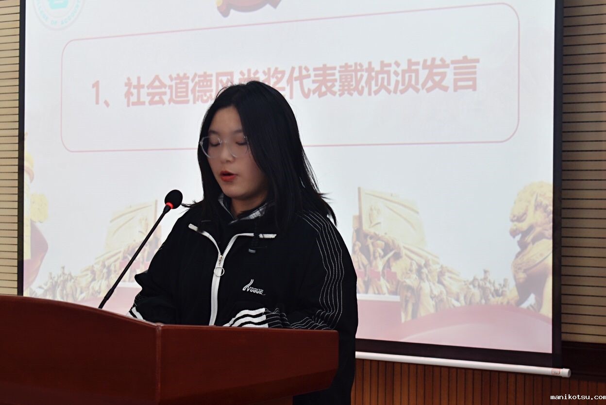 道德风尚奖代表戴桢浈同学分享了两点参与实践的心得:一是向道德模范学习,时时处处以道德模范为榜样;二是积极参加志愿服务活动,在实践中感受善的力量。德育标兵代表彭佳同学、三好学生代表罗心雨同学、优秀班干部代表姚再明同学3人都谈到,大学生要积极参加活动,丰富自身阅历;向模范学习,汲取正能量;立足当下,扎实学好专业知识,以过硬的综合素质勇敢肩负起当代大学生的使命和责任。