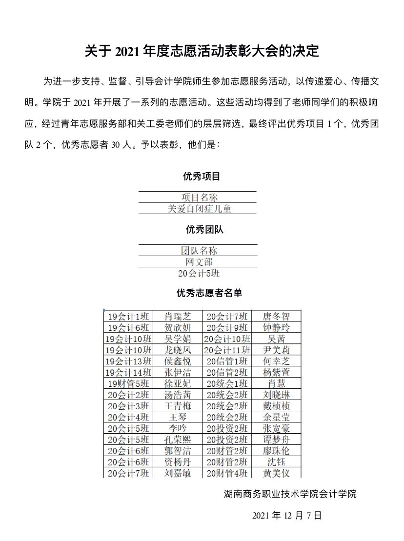为弘扬奉献精神,激励更多同学参加志愿活动,会计学院于12月21日中午12:20在办公楼六楼学术报告厅举行会计学院2021年志愿服务工作总结暨表彰大会。党总支书记黄铖老师、学工二支部书记浣晓璐老师、关工委副主任方冬玲老师出席会议。青年志愿服务部部长唐敏娟担任主持人。优秀志愿者代表及团学分会相关部门成员参会。