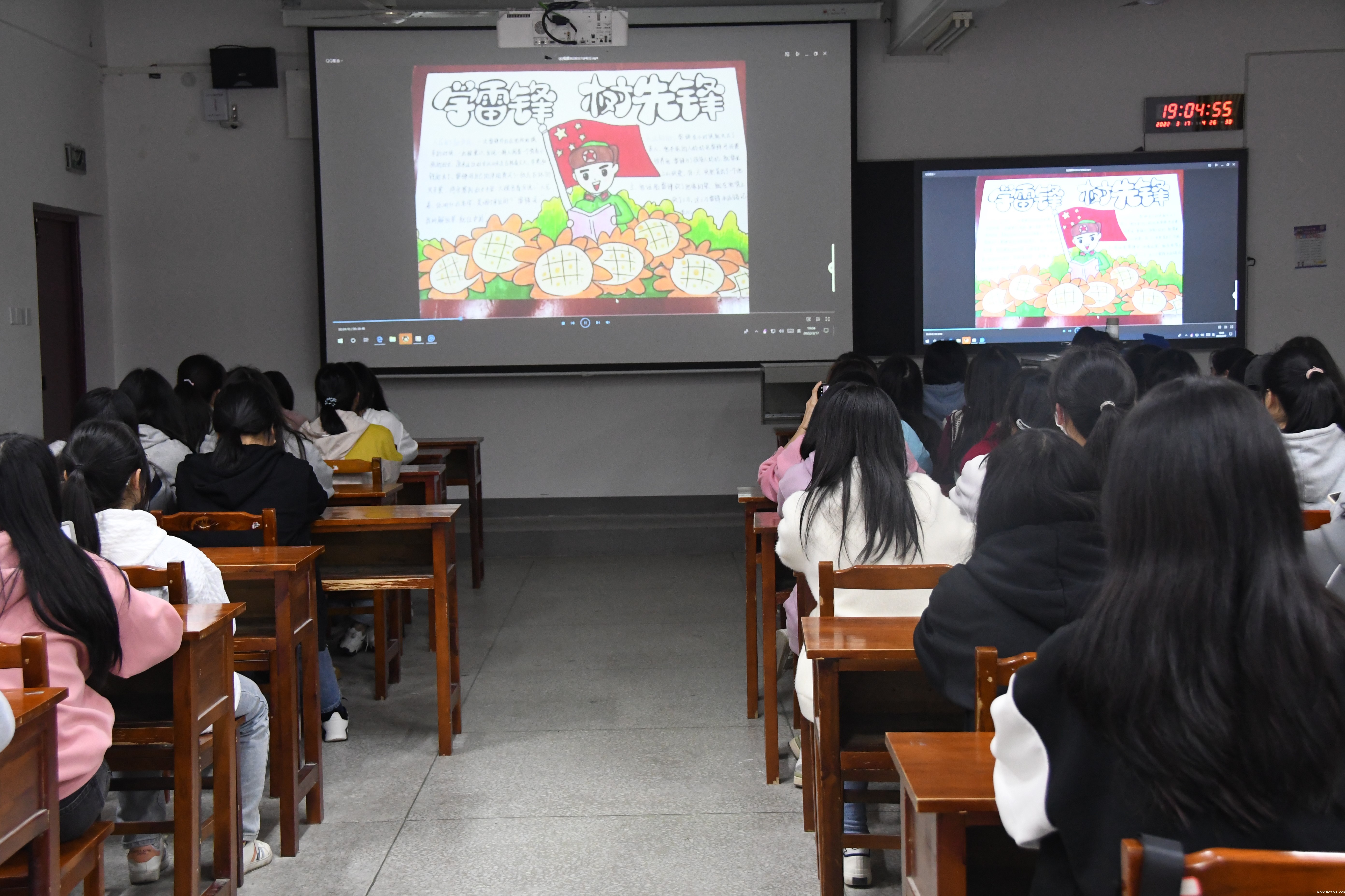 随后进入作品展示阶段,有的作品以新闻报道形式讲述雷锋故事;有的作品展示着雷锋在红旗下给向日葵念书的场景,意喻着雷锋深深地影响后人;有的作品展示雷锋手握枪、眺望天安门的场景,生动地展现出雷锋对党和国的忠诚。