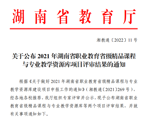 2022年2月14日,关于公布2021年湖南省职业教育省级精品课程与专业教学资源库项目评审结果公布(湘教通〔2022〕11 号),我院3门课程获批立项。其中李玄老师主持建设的《管理会计》、杨小燕老师主持建设的《会计信息系统应用(供应链)》、周若谷老师主持建设的《EXCEL 在财务中的应用》被确定为2021年湖南省职业教育高职精品在线开放课程建设项目