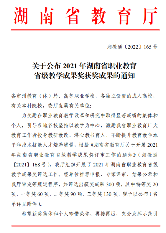 我院教师获2021 年湖南省职业教育 省级教学成果奖