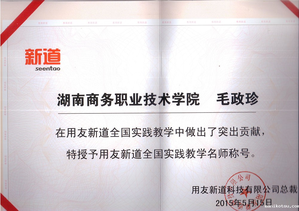 毛政珍老师荣获2015年用友新道全国实践教学名师
