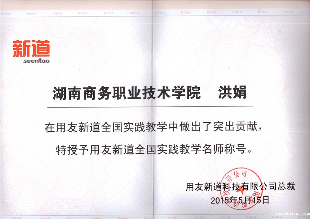 洪娟老师荣获2015年用友新道全国实践教学名师