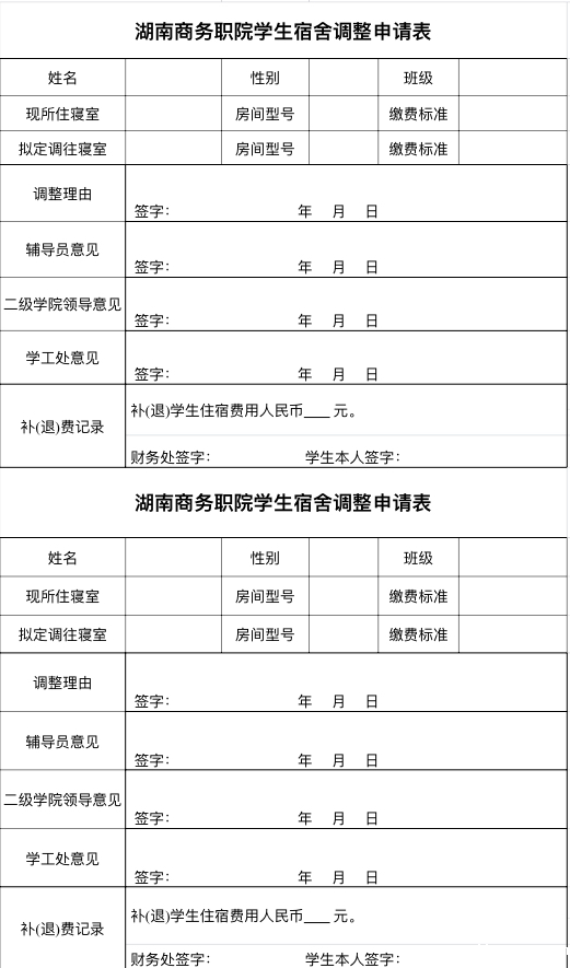 湖南商务职院学生宿舍调整申请表