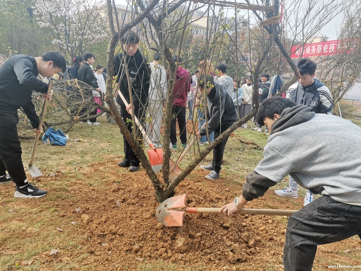 植树现场,人声鼎沸,大家纷纷拿起工具,挖坑刨土、挥锹填坑、扶树正苗、踩土压实,有条不紊地投入到植树活动中,到处洋溢着热火朝天的劳动氛围。院长皮卫也亲自上阵挖坑、栽树、填土,鼓励同学们撸起袖子加油干。学生志愿者在各个环节衔接有序,配合默契,充分发扬了“奉献、友爱、互助、进步”的志愿者精神。在大家的努力下一棵棵梅树矗立起来,田径场东侧的空地焕然一新,校园里春的气息更加浓厚。