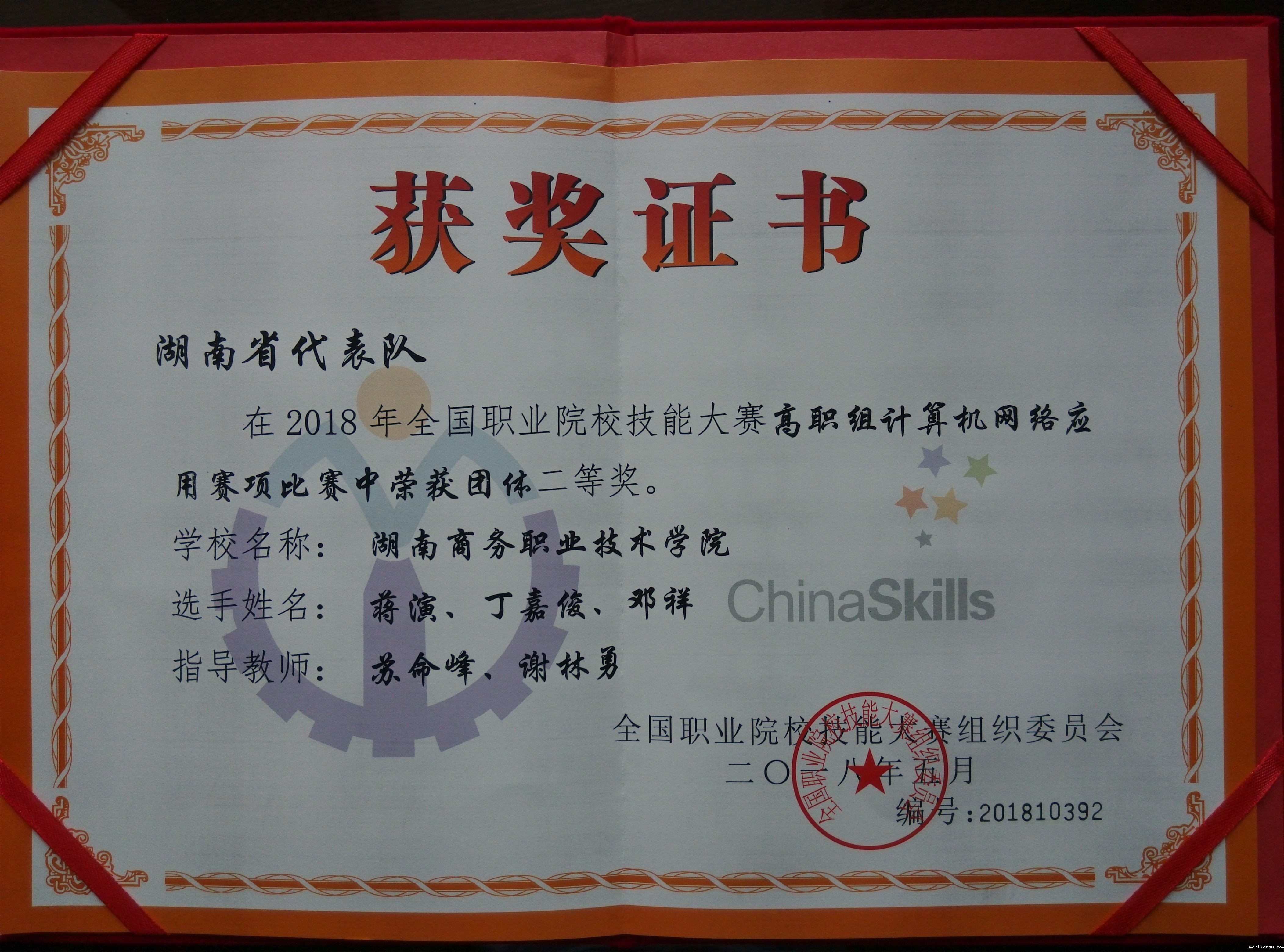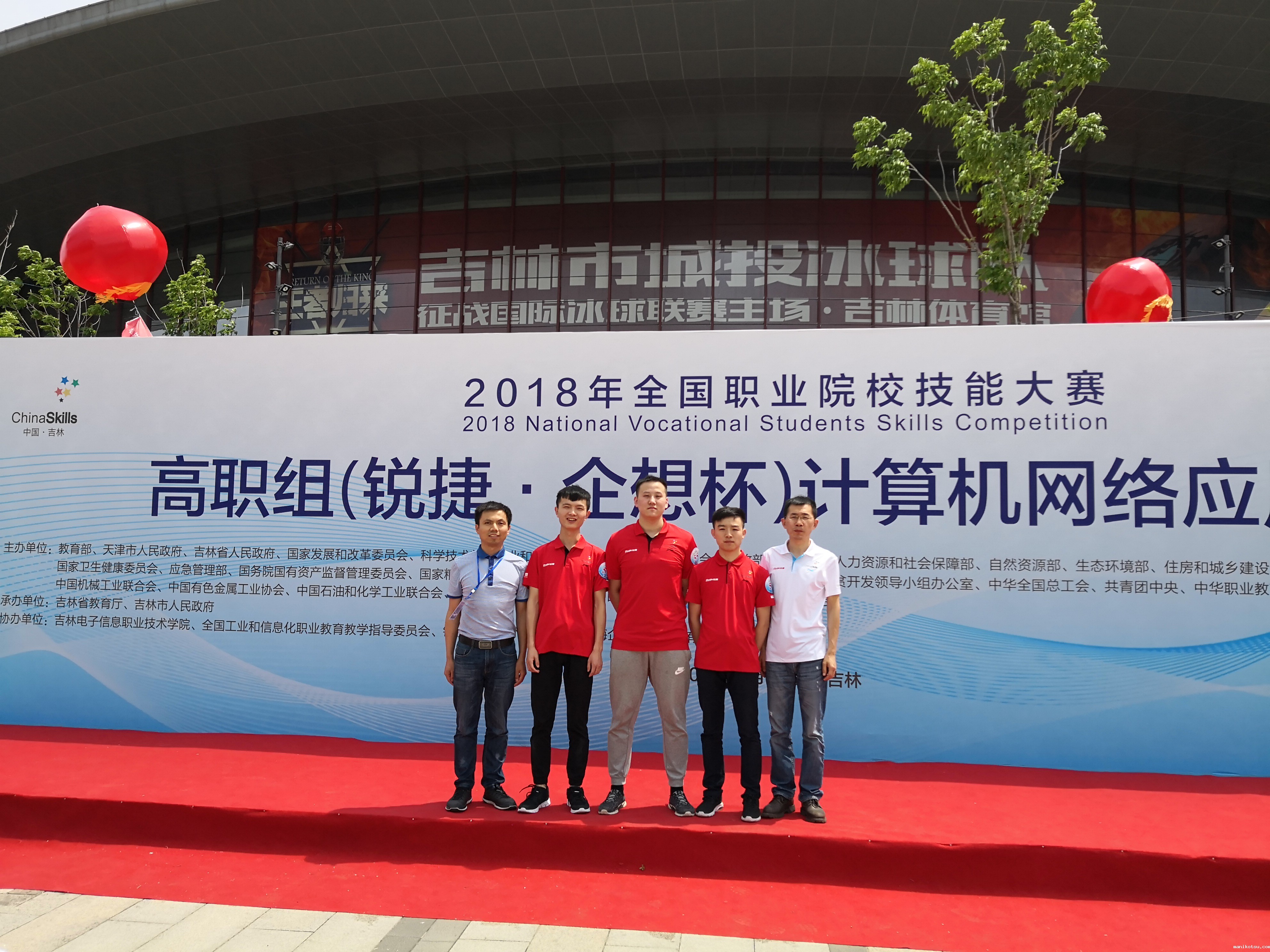 6月4日,2018年全国职业院校技能大赛 “计算机网络应用”赛项在吉林电子信息职业技术学院落下帷幕。来自全国86支参赛队258名优秀选手经过层层选拔决战吉林,由我院计算机网络技术专业苏命峰、谢林勇两位指导教师,15计网1班蒋演,15计网2班丁嘉俊、16计网2班邓祥三位学生组成的代表队经过紧张而激烈的角逐,最终以稳定的心理素质、精湛的专业水平、良好的合作精神喜获团体二等奖,这是计算机网络专业第三次登上国赛的领奖台。