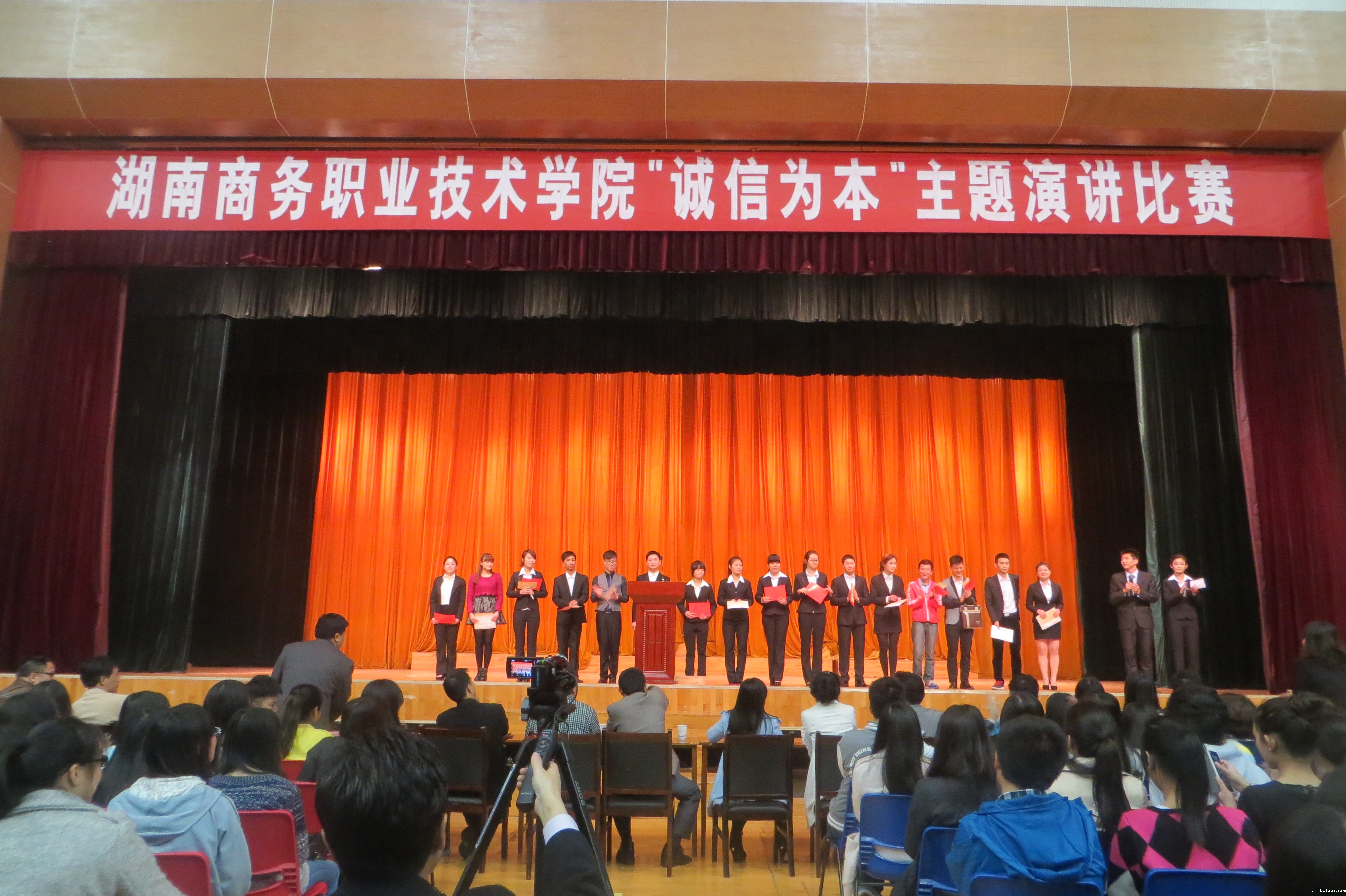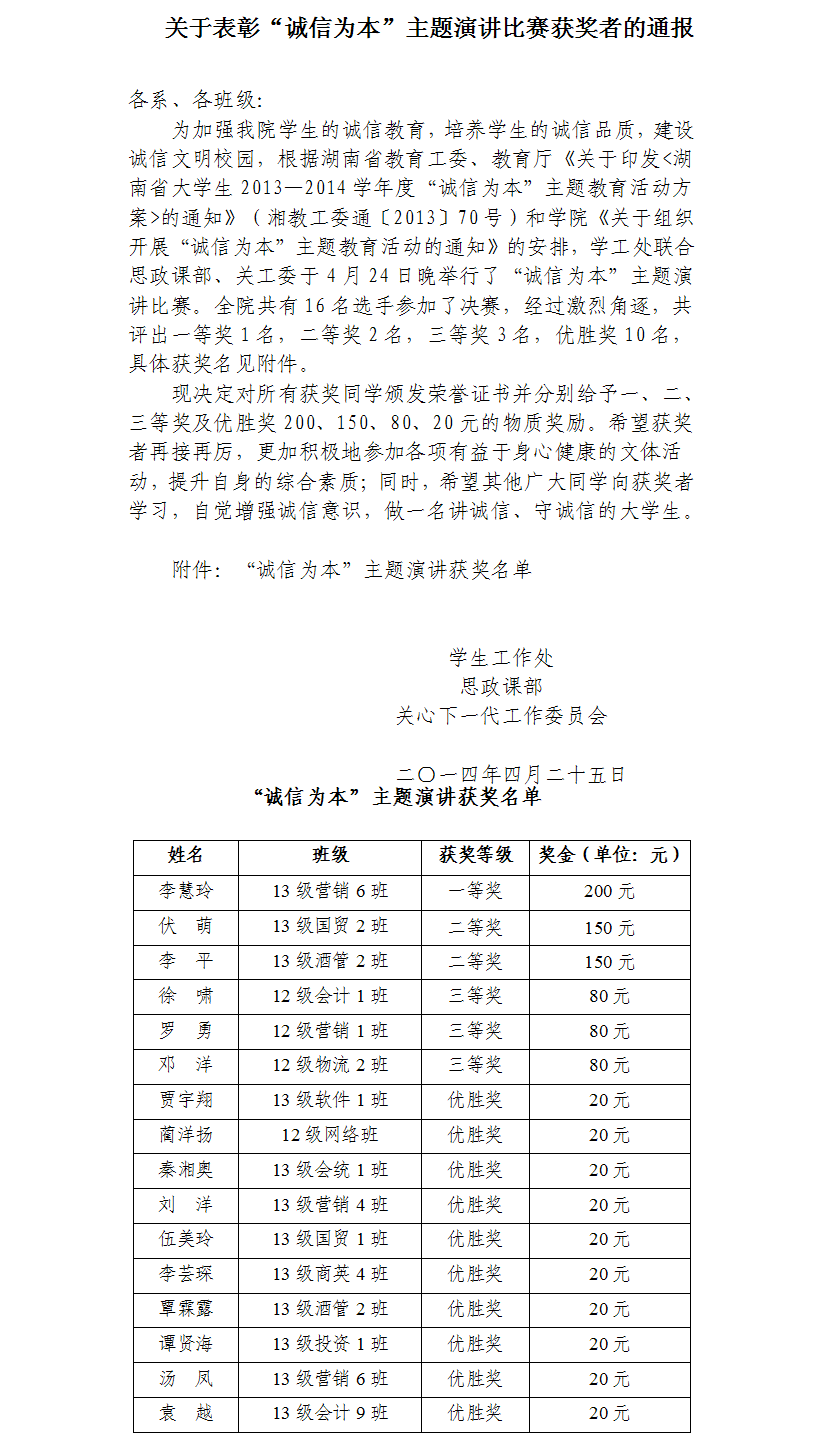 为加强我院学生的诚信教育,培养学生的诚信品质,建设诚信文明校园,根据省教育工委、教育厅《关于印发<湖南省大学生2013—2014学年度“诚信为本”主题教育活动方案>的通知》(湘教工委通〔2013〕70号)和学院《关于组织开展“诚信为本”主题教育活动的通知》的安排,学工处、思政课部联合关工委于3-4月举行了“诚信为本”主题演讲比赛活动。