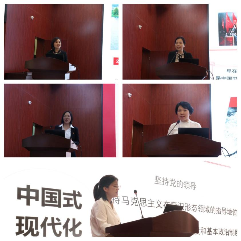 马克思主义学院孔霞老师以《以中国式现代化 全面推进中华民族伟大复兴》为题、王智慧老师以《畅通社情民意交汇点 实践全过程人民民主》为题、乔颍老师以《如何理解全面依法治国是国家治理的一场深刻革命》为题、汤艺峰老师以《凝心铸师魂 立德育新人》为题、付译文老师以《使命如磐 贡献青春力量》为题先后进行了微宣讲。她们围绕党的二十大精神,讲理想、话初心、谈体会、述心得,声情并茂、娓娓动人。或从中国式现代化建设的伟大实践入手,阐释美丽中国建设的重大意义;或从身边的普通人、平凡事入手,分享国泰民安的温暖点滴;或从立德树人的耕耘收获入手,展示科教兴国战略的壮阔前景。