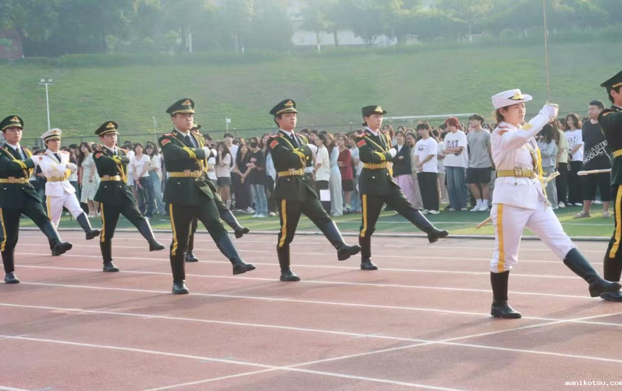 国旗队步伐整齐,护卫五星红旗庄严入场。随着《义勇军进行曲》奏响,五星红旗冉冉升起,全体师生庄严肃立,行注目礼。