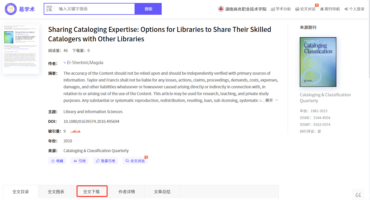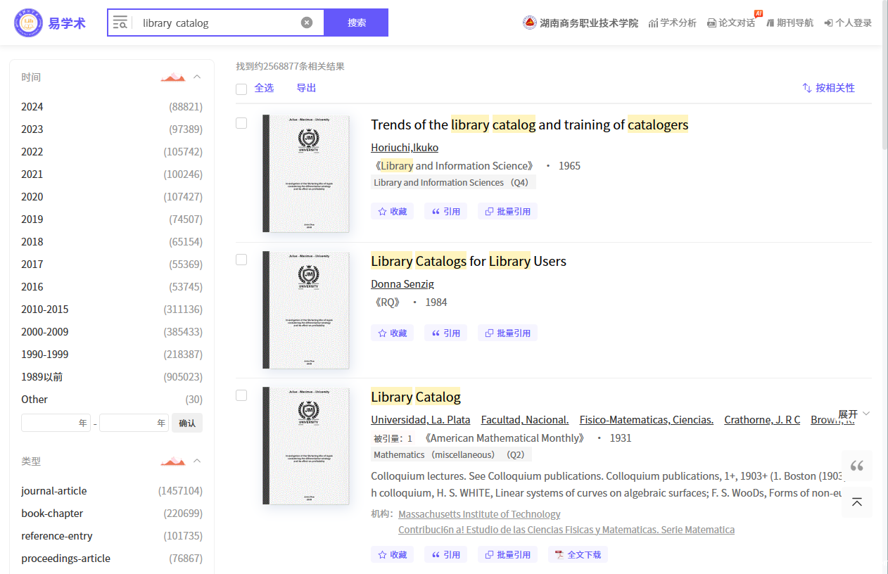 EA学术资源库(易学术)涵盖了13万种外文期刊、1.6亿条外文文献数据、26亿条引文数据,提供6300万篇全文下载。全面覆盖科技、医学、农业、交通、航空航天、社会科学、艺术与人文科学等全球研究成果。资源库使用大数据分析和人工智能(AI)技术,将散落于互联网中的外文文献信息进行汇聚整合,并对海量文献数据进行深度挖掘、精准提炼、关联分析和精细加工后形成了高质量外文文献数据库和自有引文网络数据库。该数据库利用人工智能分析引擎对高引用文章和经典文献进行文献总结,从而更好地辅助读者对学术文献的理解和利用,极大提升科研效率。