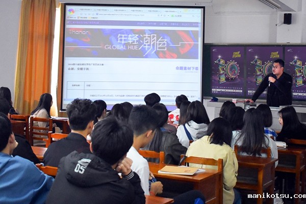 创意分享会一开始,主持人高宏华先通过演示幻灯片,简略介绍了大广赛的含义以及本届大广赛的命题,然后向大家具体分享了在“湖南大广赛启动仪式”中的那些精彩演讲内容:有刘瑞武教授、刘铁男、吴孟生、邓木荣、杨海标先生等人的演讲。随后,参与过“湖南大广赛启动仪式”的17电技1班李毅豪、17电技2班李陆明和16艺术2班肖晶等3位同学也分别讲述了自己对大广赛的看法,与大家一起分享自己的心得体会。