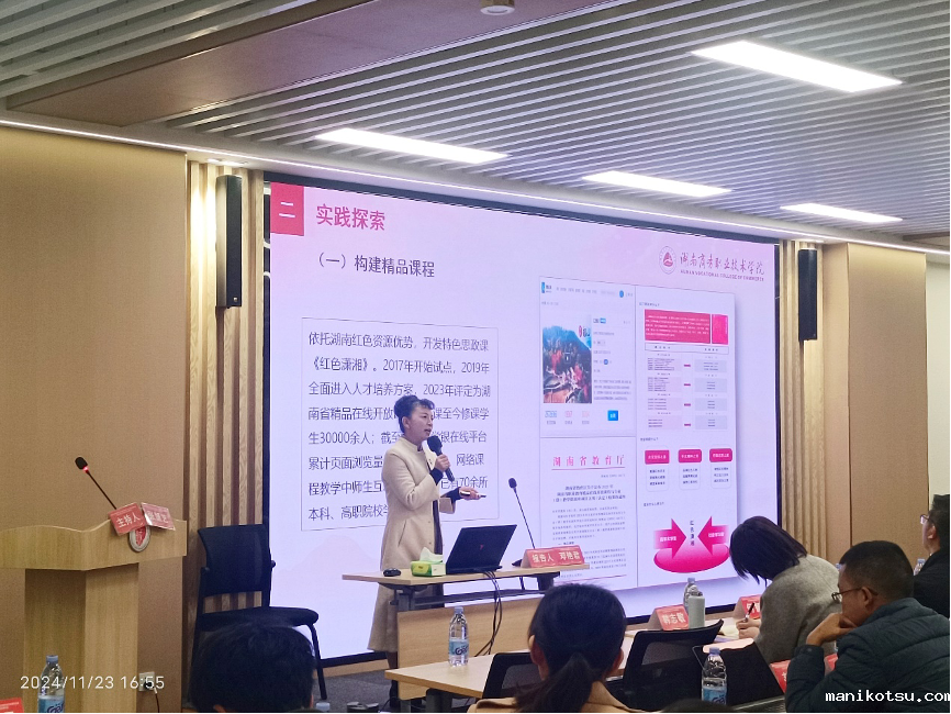 “在红色潇湘的课堂上,最让学生印象深刻的,是由师生共同完成一场场红色之旅。”邓艳君在分享中,着重提到了课程团队探索的“1+1沉浸式教学法”。“《丹心永照后来人》《永不消逝的电波》《无字书》《决然的身影》《断肠明志铸忠诚》《永恒的精神坐标》……在一个个声情并茂的情景演绎中,同学们生动诠释了夏明翰、李白、陈毅安、黄君珏、陈树湘、雷锋等湖湘英烈的英勇事迹,也使自己受到深刻心灵洗礼。”