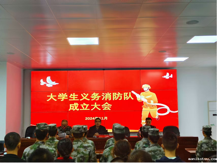 为贯彻落实《中华人民共和国消防法》和上级要求,加强消防队伍建设,充实消防安全力量,完善群防群治体系。学院于2024年11月21日在学生教官自训队会议室举行了大学生义务消防队成立大会。