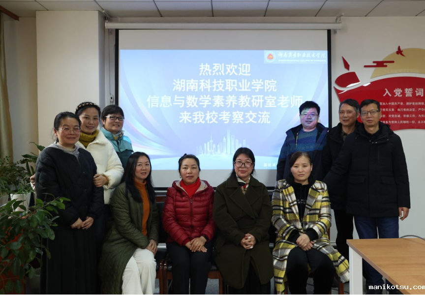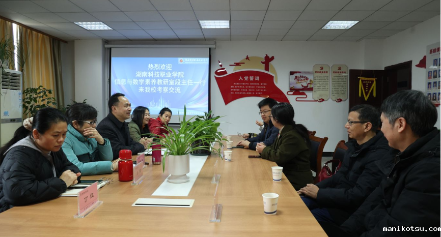 为促进校际间信息素养与数学课程教学经验交流,共同探讨新形势下数学与信息技术课程的教学改革与发展方向。2025年2月27日上午,湖南科技职业学院信息与数学素养教研室主任段琳琳一行来我校基础课部信息素养与数学教研室进行交流研讨。参加本次交流活动的人员有我校基础部主任吴玉光,信息素养与数学教研室主任黄芳,以及两校信息素养与数学教研室教师代表。