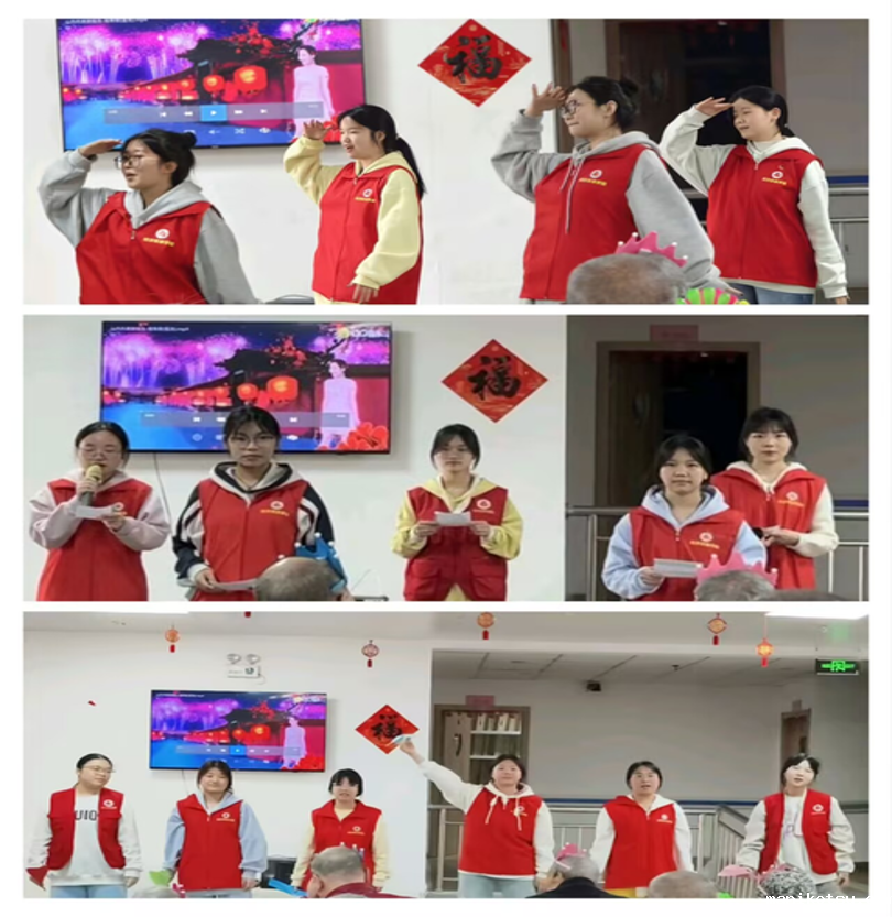在康养中心的活动大厅里,身着红马甲的志愿者们活力满满,一支欢快的手势舞《勇气大爆发》迅速燃爆现场氛围。有的志愿者以清朗嗓音在《春》的文字里描绘春意盎然,寓意“暮年亦是人生的春天”;有的用情景表演串联童年趣事,《我的纸飞机》逗得老人们开怀大笑……踩着轻快的步伐、伴着温情的音乐、舞动婀娜的身姿,笑语欢声此起彼伏。