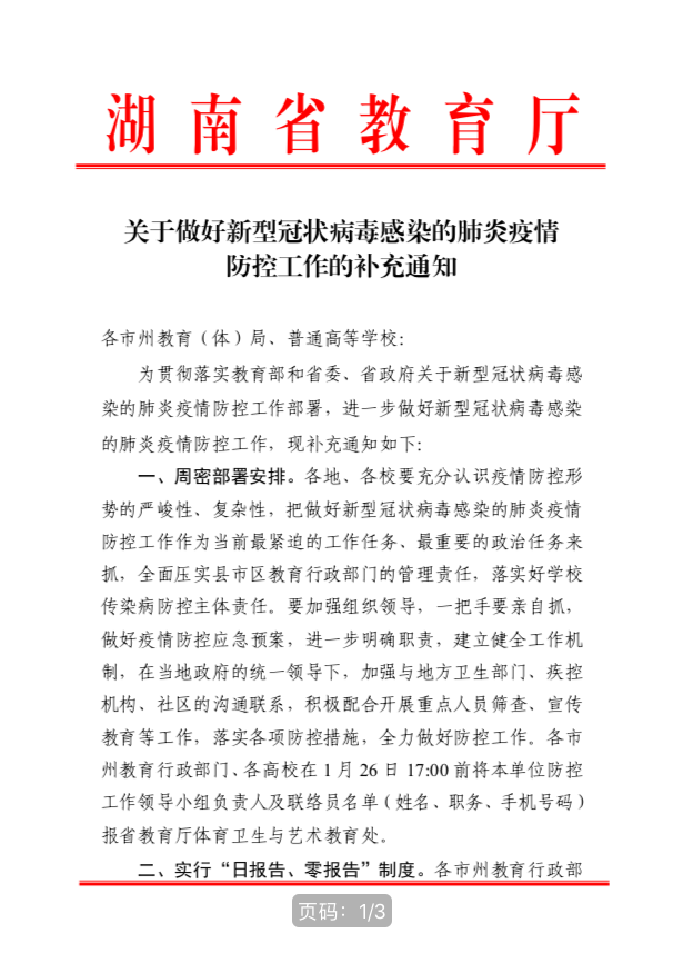 湖南省教育厅关于做好新型冠状病毒感染的肺炎疫情防控工作的补充通知