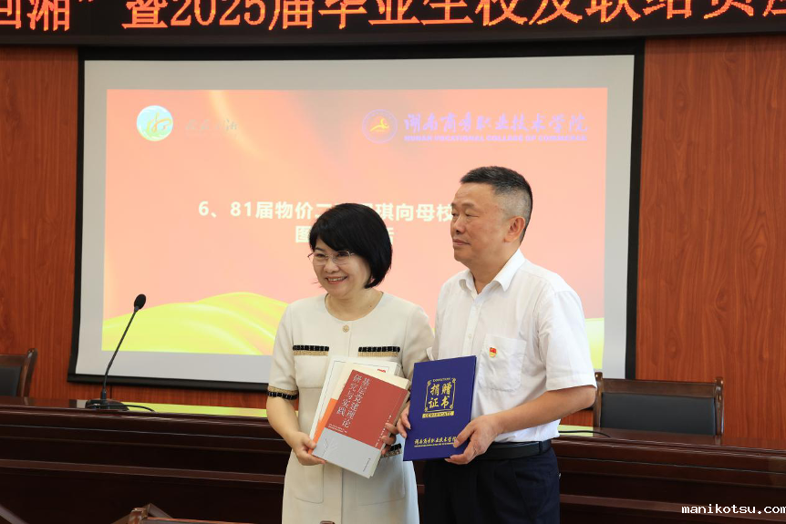 随后的分享环节,校友们的故事如时光画卷徐徐展开:岳阳校友会会长文选寄语学弟学妹大展宏图,为母校增光添彩;株洲校友会秘书长杨建新动情讲述从职场新人到行业骨干的蜕变之路;长沙校友会副会长陈煜博分享创业维艰中的破局智慧;81届棉检班苏光荣追忆恩师教诲同窗情,往事历历惹人怀。往昔的课堂点滴、社团趣事被一一唤醒,会场内掌声与欢笑交织。81届物价二班周琪校友更向母校捐赠其主编、获省级权威部门和专家高度肯定的党建书籍3种3册,为湖南基层党建服务指引,为全国献上湖南经验。