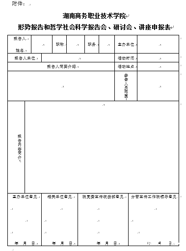 2.面向本部门或二级学院师生举办的报告会、研讨会、讲座、论坛,须经本部门或二级学院党政负责人审批同意,再报党委宣传统战部审批后方可举行。如属于湘商职院发【2012】7号文件规定的学术活动,需按该文件规定由科研产业处审批后,再报党委宣传统战部备案。